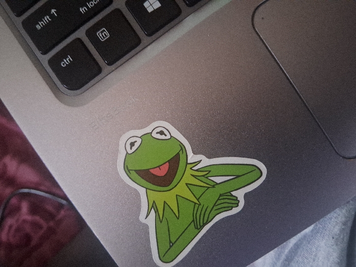 An overhead, angled view captures the upper surface of a light grey metallic HP EliteBook laptop. A sticker of Kermit the Frog, depicted smiling with both hands clasped beneath his chin, is affixed to the laptop's left palm rest area. The sticker features a green frog, a white eye outline, and a pink mouth with a red tongue, all outlined in white. To the right, a portion of the laptop's black keyboard is visible, showing keys labeled "ctrl," "shift ↑," "fn lock," and the Windows logo. The lower right segment of the laptop's trackpad area is also visible. The laptop rests on a textured light grey fabric, possibly clothing or upholstery. In the blurred background, a dark maroon fabric object and a black electrical cable are discernible. The scene is located in Kahawa Sukari ward, Kenya.