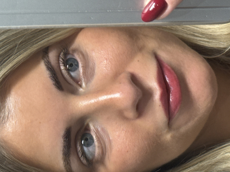 A close-up portrait shows a woman with fair skin, blonde hair, and striking blue eyes. Her face is slightly turned, presenting a direct gaze. The woman wears a glossy, pink-toned lip color. One of her fingers with a polished red nail intrudes the shot from above. A neutral, grey surface partially obscures the upper portion of the frame.