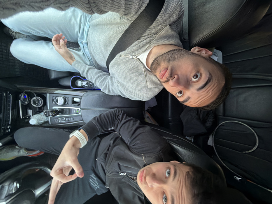The image depicts two males inside the front cabin of a vehicle, viewed from an elevated perspective. The individual on the left, seated in what appears to be the driver's seat, is a male with short dark hair, a beard, and light skin, wearing a light grey quarter-zip sweater over a white shirt, and light blue jeans. A black seatbelt is across his chest. He exhibits a facial expression with wide eyes and pouted lips, looking directly at the camera. A dark mobile phone is partially visible beneath his left hand. The individual on the right, occupying the passenger seat, is a male with curly dark hair, light blue eyes, and light skin. He wears a black zippered hoodie and black track pants with a white logo (partially legible as "PUMA") on the left thigh. His facial expression includes pouted lips, directed at the camera. His right hand is raised, with the index finger and thumb touching, forming a circular shape, while the other fingers are extended. A white watch is on his left wrist. The vehicle's interior features black leather upholstery on the seats and a prominent center console containing various controls and cup holders, one of which holds a clear plastic water bottle. A coiled cable is visible on the rear seat behind the driver. The image provides no external context to specify a location within Plovdiv, Bulgaria.