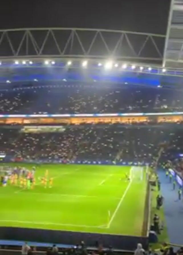 soccer stadium filled with people at night. The soccer field is green and well-lit. In one corner of the field, two teams, one in orange and the other in blue and white, are gathered. The stands surrounding the field are packed with spectators. Many of them are holding up their phone flashlights, creating a sea of lights in the stands. The stadium has a white roof structure. The lighting is bright and focused on the field. The video appears to be taken from the stands, with a view looking down at the field.