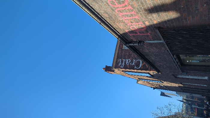 This image depicts a narrow street or alley within Cain's Brewery Village, located in the Baltic Triangle of Liverpool, United Kingdom, on a clear, sunny day. The upper half of the frame is dominated by an uninterrupted bright blue sky. The scene features two prominent multi-story brick buildings constructed of dark red/brown brick. The building on the left, slightly further in the background, has the word "Craft" painted vertically in large white capital letters on its side. This building exhibits multiple windows, some reflecting the blue sky, and a chimney stack at its apex. The building on the right, closer to the foreground, displays partially visible red lettering on its brick facade, appearing to spell "Herme" (likely part of a longer word). A grey gutter and downpipe are affixed to this building. Below the downpipe, a dark, possibly corrugated, metal shutter or awning extends over a storefront window, which shows faint interior lighting and reflections. Strong sunlight casts distinct, elongated shadows diagonally across the brick wall of the right building. In the lower left corner, bare tree branches are visible, and at the very bottom, an indistinct crowd of people suggests a busy street or pedestrian area.