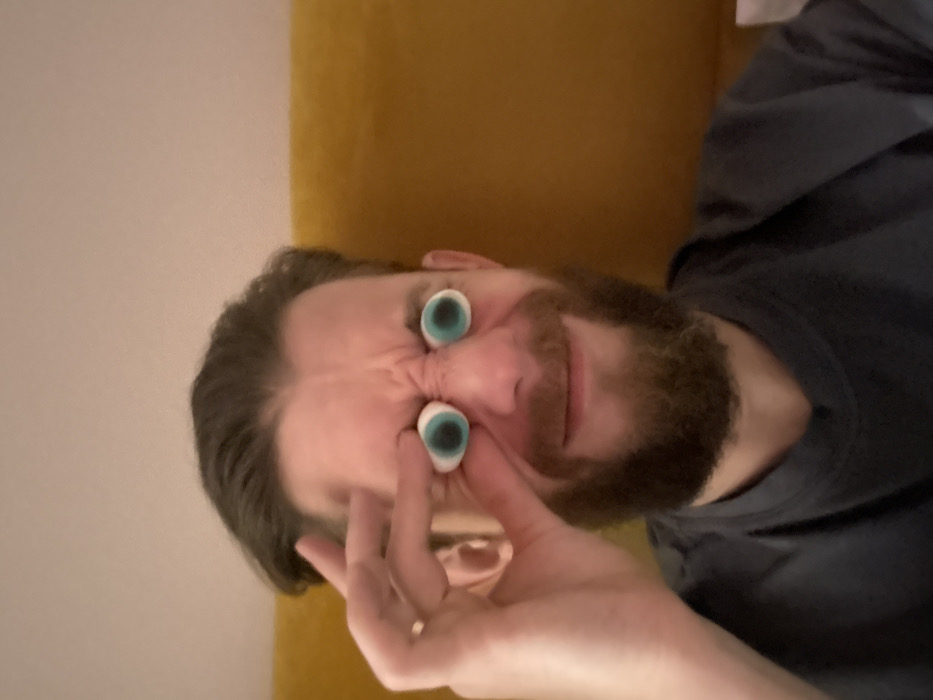 - "A bearded man is captured in a close-up shot, holding what appears to be novelty eyeball candies against his nose, distorting his expression into a humorous grimace" by FM-ARrGE2, licensed under CC BY 4.0