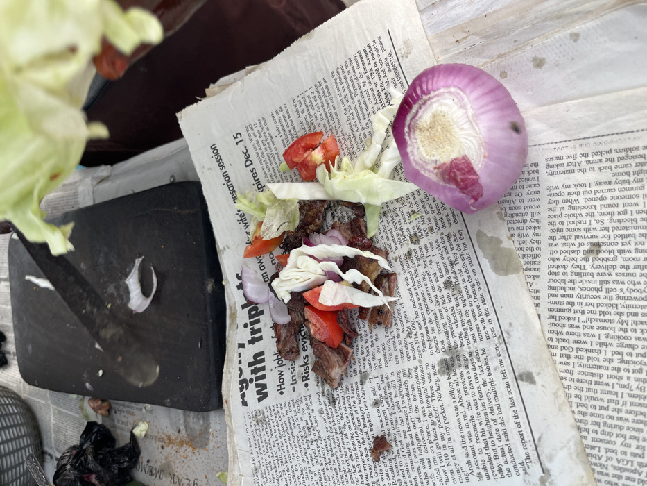 food scraps, including cooked meat, tomatoes, lettuce, and onions, scattered on a newspaper. The newspaper is open to an article and is creased with visible staining. A piece of a red onion sits prominently to the right. To the left, a black surface holds a piece of white onion, with a blurry leafy plant partially obscuring the view. Black plastic waste lies scattered below, suggesting discarded remnants.