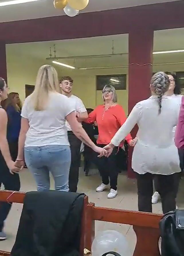A small group of people in casual clothing are holding hands and dancing in a circle in a small indoor space. Most people are wearing white t-shirts and jeans or dark pants. There are balloons attached to the ceiling. In the foreground, a table is visible with beverages and personal belongings like bags and a jacket. The room has a burgundy-colored accent wall and a drop ceiling with fluorescent lighting. There are windows visible in the background. The dancing appears celebratory.