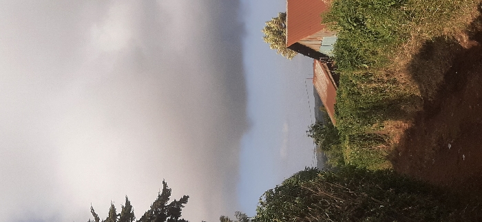 A hazy sky fills much of the left side of the image, contrasting with a clearer sky on the right. Two rustic buildings with corrugated metal roofs stand amidst green foliage and shrubbery. A dirt path runs alongside the vegetation, partially obscured by shadows. The composition is rotated ninety degrees counter-clockwise, adding an unusual perspective.