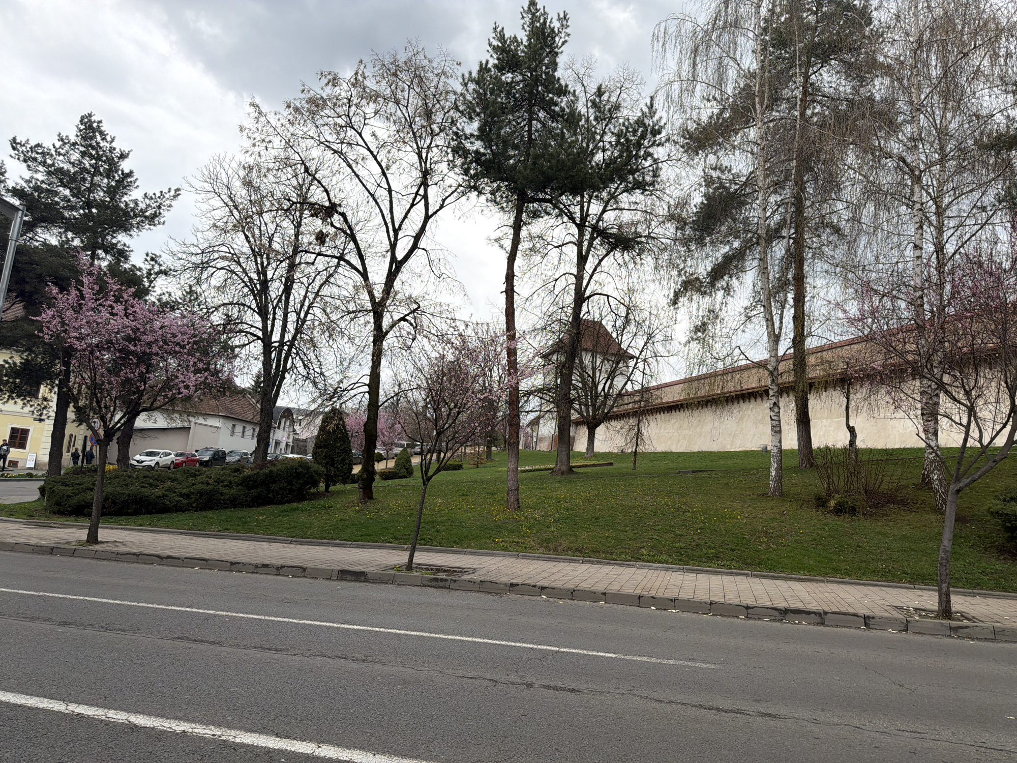 street scene in Târgu Mureș, Romania. A two-lane road with white lane markings is in the foreground. A sidewalk with brick pavers runs along the right side of the road. Beyond the sidewalk is a grassy slope with several trees, including deciduous trees with bare branches and evergreens. Some of the trees have pink blossoms. Behind the trees is a long, light-colored wall with a building visible behind it. In the background, on the left side of the image, are buildings, cars parked on the street, and people walking. The sky is overcast.