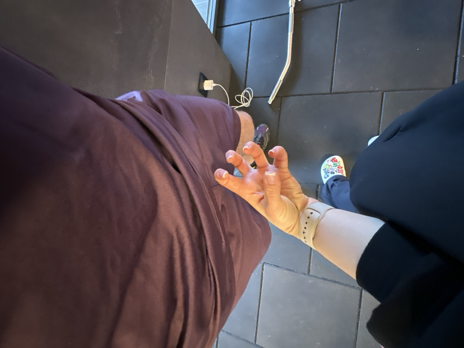 This image, captured in Pernik, Bulgaria, depicts an indoor scene from an elevated perspective. In the foreground, the lower left arm and hand of an individual are visible, extending forward. The hand is open, with fingers slightly curled and nails exhibiting a French tip style. A light-colored, possibly beige, wristband with visible perforations is worn on the wrist. This individual is dressed in dark pants and white shoes adorned with colorful, patterned designs. Positioned directly behind and slightly to the right of the foreground individual is the lower torso and upper legs of a second person, clad in a dark purple, possibly velvety, garment. One foot of this individual is partially visible, wearing a dark shoe with a light sole. The floor is composed of dark, square-sectioned tiling or rubber matting. To the right of the background individual, a black electrical outlet is mounted on a dark vertical surface, with a white charger plugged in and a coiled white cable resting on the floor. A silver-colored, curved metal bar lies horizontally on the floor in the far right mid-ground. No direct interaction between the individuals is discernible.