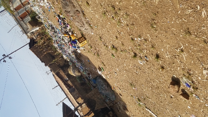 This image, taken in Jos, Nigeria, depicts an outdoor scene dominated by an extensive refuse accumulation