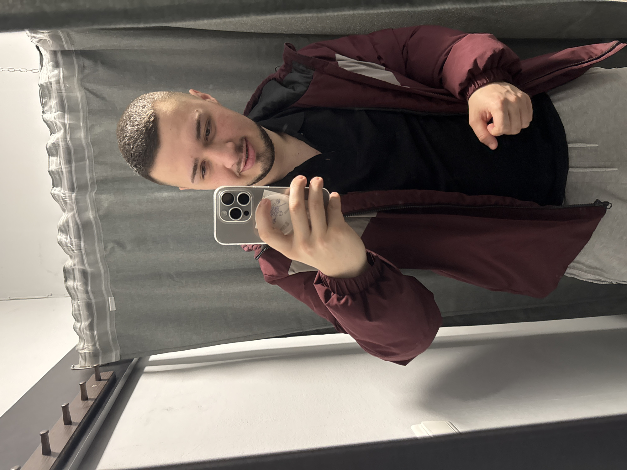 A man is taking a selfie in what appears to be a fitting room. He is wearing a black shirt, gray sweatpants, and a burgundy puffer jacket. The fitting room has a gray curtain and a coat rack with hooks. The location is unknown, but it is specified to be the city of Sofia, Bulgaria, which cannot be confirmed from the image alone.