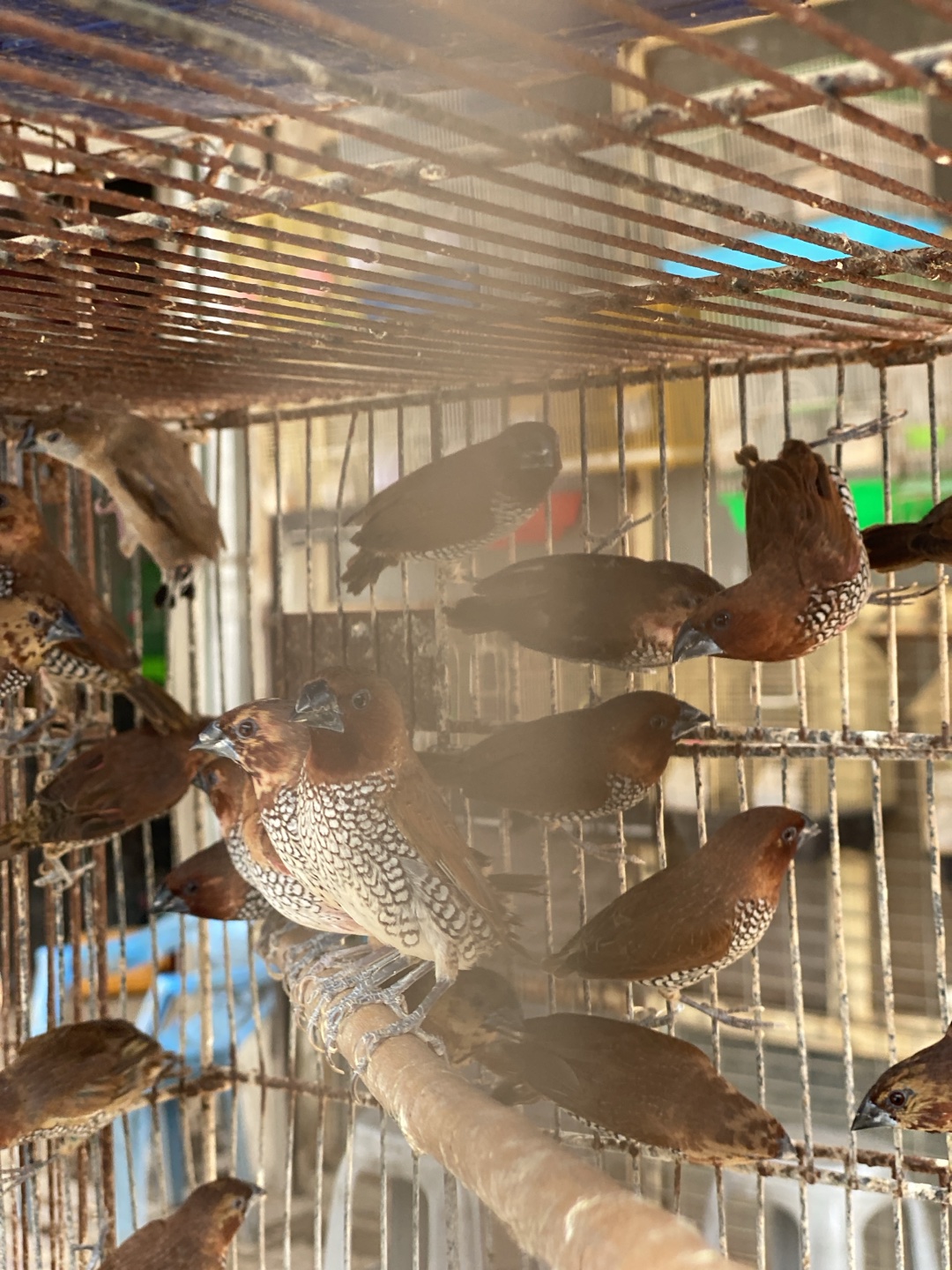 A close-up view depicts approximately two dozen small, predominantly brown birds contained within a worn, multi-tiered wire cage