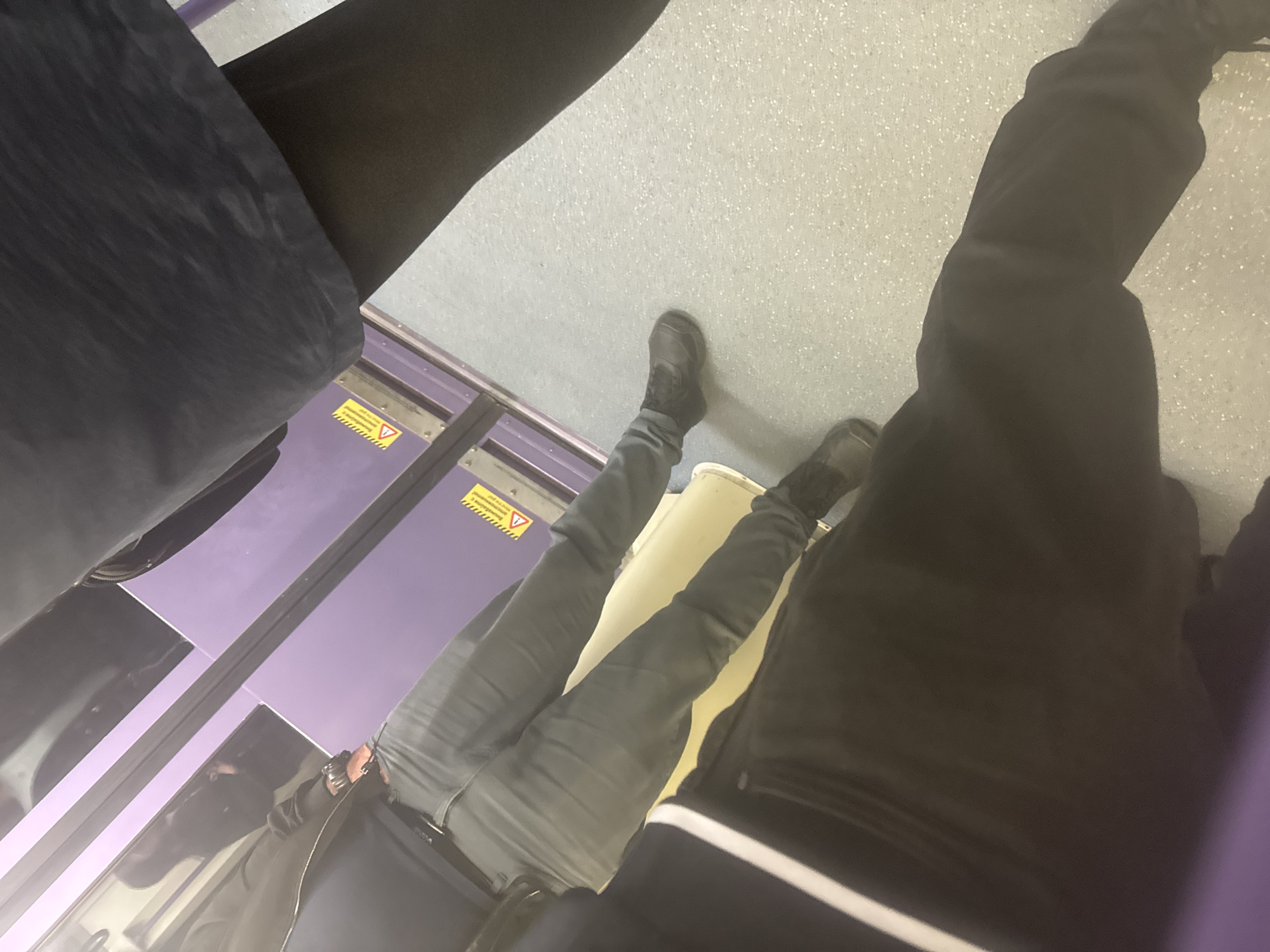 The image depicts an interior view of what appears to be a public transportation vehicle, possibly a tram or bus. Several people are visible, though only their lower bodies and legs are in the frame. One person wears dark tights and a dark skirt or dress. Another person wears gray jeans and dark shoes or boots. A third person wears dark pants and shoes, partially obscured in the frame. The environment is characterized by a light gray floor, purple interior panels with warning stickers, and a white bench seat. The overall composition suggests the perspective of someone standing or sitting on the vehicle. There is insufficient information to determine the location in Sofia, Bulgaria, from the image alone.