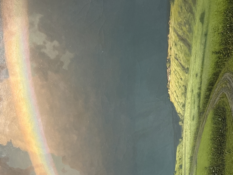 A painted landscape depicts a rural scene under a dramatic sky