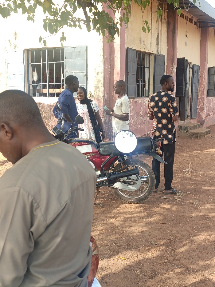 A building with closed, dark-colored shutters on some windows is surrounded by several people. A man in a patterned shirt stands near the building, while three others converse near a motorcycle parked on the red-brown ground. A person in a grey robe is partly visible in the foreground, also near the motorcycle. The scene is bathed in sunlight, with trees casting shadows.