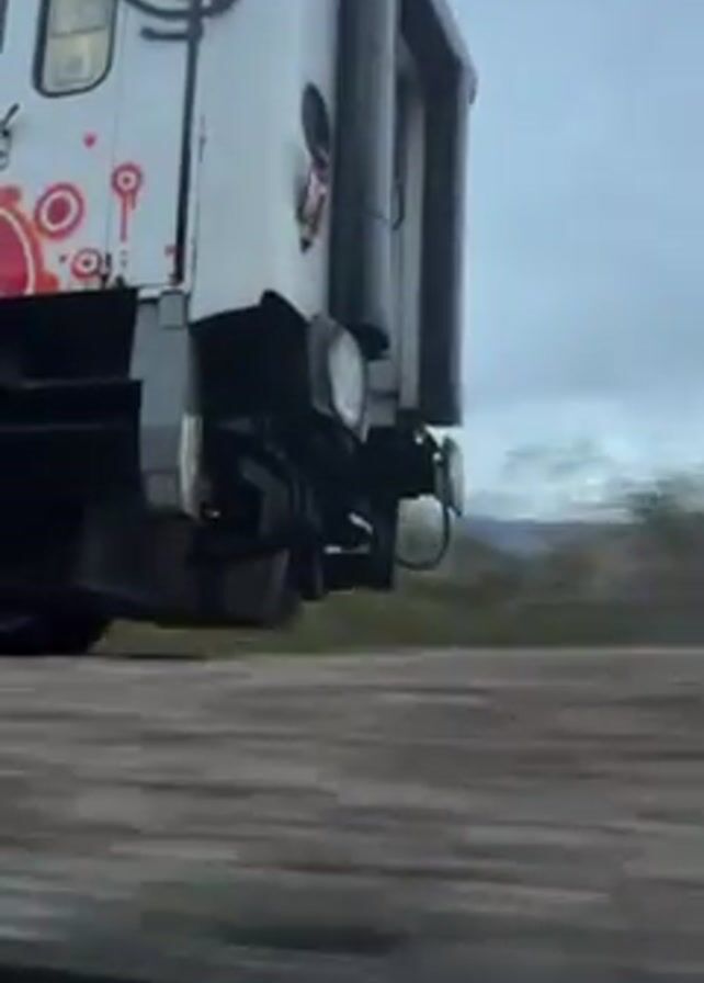 train car moving along railroad tracks. The train car is covered in graffiti and has a door. The background shows a body of water and mountains under a cloudy sky. The camera appears to be moving alongside the train car.