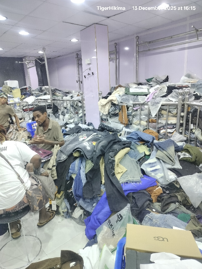 A cluttered clothing store interior features piles of jeans, shirts, and other garments overflowing from shelves and the floor. Two people are visible sorting through the clothes, while another sits on a stool nearby. A cardboard box labeled "UGG" is visible at the bottom, indicating some of the items may be shoes. The image is stamped "TigerHikima" and "13 December 2025 at 16:15."