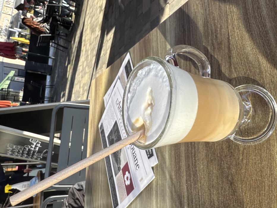 The image presents an outdoor cafe scene in Reichstett, France, viewed from a low perspective. In the immediate foreground, a clear glass mug, featuring a handle and a footed base, contains a three-layered beverage. The liquid layers are dark brown at the bottom, transitioning to a lighter brown in the middle, topped by a thick stratum of white foam. A light-colored, possibly paper, straw is inserted into the foam at an acute angle. The mug rests on a light-brown wooden table exhibiting distinct grain patterns. Behind the beverage, a folded newspaper or magazine, partially readable as "L'Ancienne," lies flat on the table. The mid-ground reveals an outdoor patio paved with patterned stones, illuminated by direct sunlight, casting sharp shadows. Several metallic grey outdoor tables and chairs are visible. To the left, a black A-frame chalkboard sign displays white text. In the background, two individuals are seated at a table; one person with long, reddish-brown hair is discernible. Another person's back is partially visible to the far left. Distant elements include parts of buildings and red and green awnings or umbrellas.