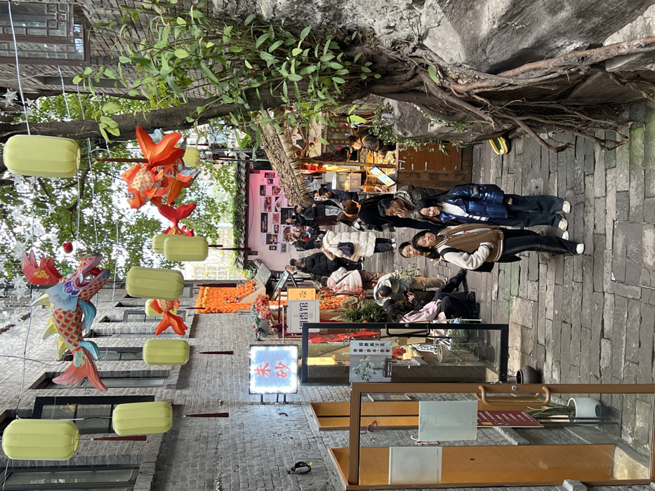 An outdoor alleyway is lined with people, shops, and colorful decorations. The ground is paved with stone bricks. Display cases and storefronts are visible on either side of the path. Hanging from the buildings above are yellow lanterns and decorative orange fish. A tree with exposed roots grows overhead, its branches extending across the alley. Several people are walking or standing along the path, looking at the shops and decorations.