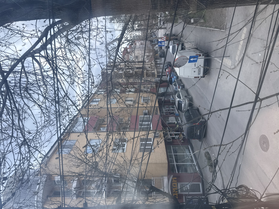 The image provides an elevated, matter-of-fact view of a street in Ruse, Bulgaria, confirmed by a visible "P" series license plate (P 8408 PA) on a white van. The scene is observed through a dense lattice of bare, intricate tree branches and numerous black and beige utility lines, indicative of late winter or early spring under an overcast, light grey sky. The street, paved and appearing two-way, curves slightly to the right, receding into the background. On the left, a multi-story building dominates the foreground, featuring a light yellow-orange facade, red-railed balconies, and multiple windows. Its ground floor houses commercial establishments with large glass shopfronts and Cyrillic signage, including "ИМАN" partially visible on a corner unit. Several outdoor air conditioning units are mounted on the building's exterior. Similar residential and commercial buildings line both sides of the street further down. Vehicles are parked along both curbs. On the left, a dark-colored minivan or small SUV is parked in front of the corner shop, followed by a silver SUV and a line of other cars. On the right, a white delivery van, identifiable by its "P 8408 PA" license plate, is parked facing away from the viewer. A blue circular "Ahead Only" traffic sign is mounted on a pole immediately behind the white van. Further down the street on the right, a blue square parking sign with a white "P" and a yellow rectangular parking sign are visible. A single human figure is discernible on the right sidewalk, walking away from the viewer near the white van. The sidewalks are concrete, and a stack of concrete blocks or paving stones is present on the sidewalk in the lower-left quadrant. A metal manhole cover is visible on the street surface.