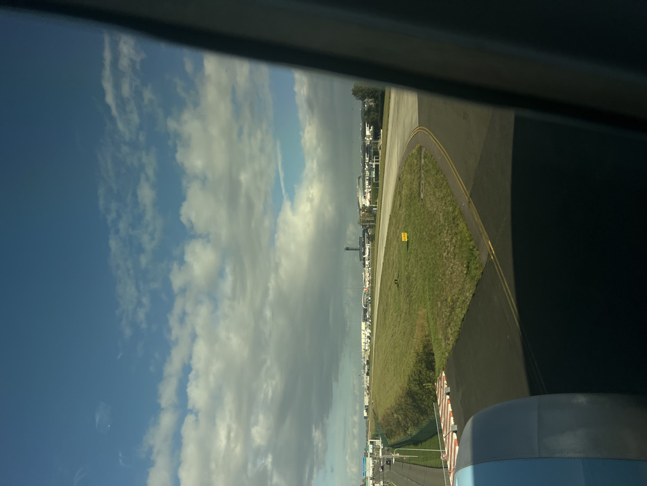 The image provides a detailed view of Charles de Gaulle Airport (CDG) in Tremblay-en-France, France, observed from an aircraft window. The lower left of the frame reveals a portion of a light blue and grey aircraft engine cowling. The immediate foreground consists of a dark asphalt taxiway with distinct double yellow centerline markings, which curves slightly to the right and is partially obscured by the aircraft's shadow. Adjacent to the taxiway, green grassy terrain extends towards the left, sloping down to a perimeter fence. Beyond this fence, a multi-lane road is visible, with several vehicles in motion. In the midground and background, the airport environment unfolds. Additional asphalt runways and taxiways are discernible, leading towards the main airport complex. Numerous airport buildings, including terminals and hangars, are visible in the distance. A prominent dark grey air traffic control tower stands centrally in the background. Several commercial aircraft are parked or taxiing on the distant airfield. The sky above is characterized by scattered white and grey cumulus clouds against a clear blue background, indicative of daylight. No specific individuals or direct human interactions are clearly identifiable in the scene.