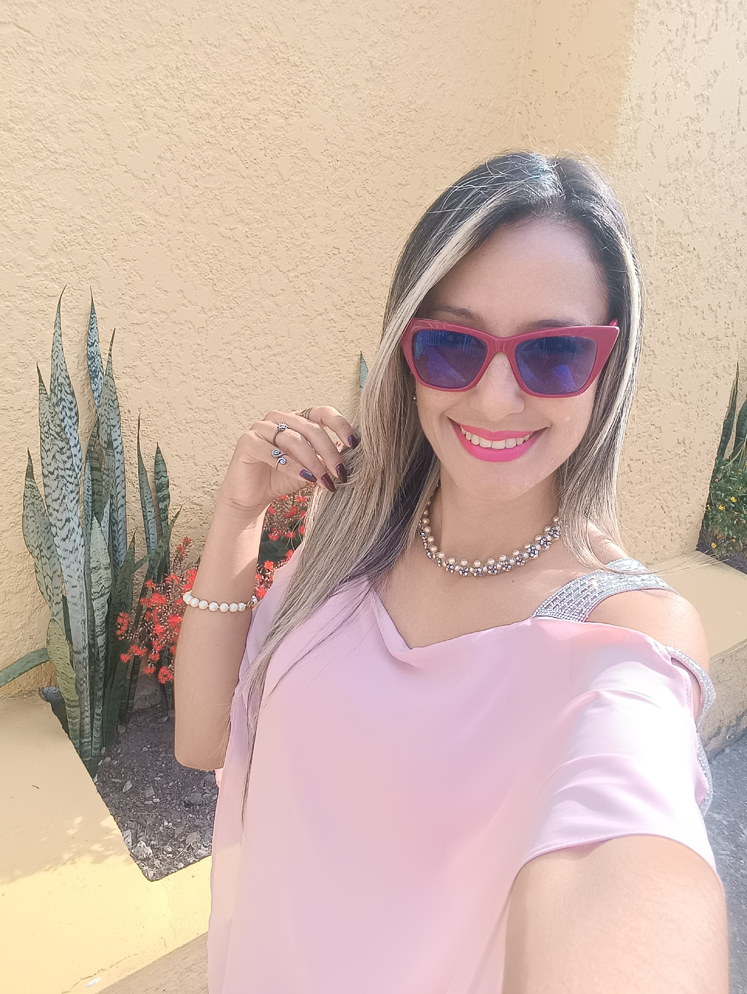 A female individual is depicted in a close-up, selfie-style photograph taken outdoors in Las Tejerías, Venezuela. She occupies the central foreground, smiling directly at the viewer with visible pink lipstick. Her long, straight hair, featuring blonde highlights, frames her face. She wears red, cat-eye style sunglasses with purple-tinted lenses. Her attire includes a light pink, off-the-shoulder top with a visible shimmering, possibly sequined, strap on her right shoulder. Accessories include a pearl and jeweled necklace, a pearl bracelet on her left wrist, and multiple rings with dark nail polish on her left hand, which is positioned near her hair. The background features a textured, light yellowish-brown stucco wall. To the subject's left, a raised planter contains tall Sansevieria (snake plant) leaves with green and grey variegation, alongside smaller plants exhibiting red blossoms. The environment is brightly lit by natural sunlight.