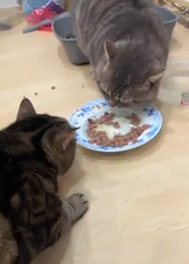 On a light-colored wooden floor, two cats are eating cat food from a small blue and white plate. One cat, a large, grey tabby, is actively eating from the plate. The other cat, a brown tabby, is lying down near the plate and watching the other eat, with one paw extended towards the plate. Behind the cats, there is a grey feeding bowl, some miscellaneous items, and a piece of furniture. The camera is positioned low to the ground, at the cats' level. A faint growl can be heard.