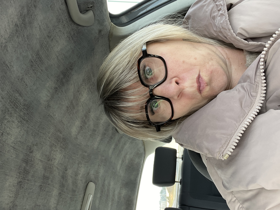 An individual is depicted inside a vehicle in Andrézieux-Bouthéon, France. The subject is a middle-aged person with blonde hair styled with bangs, wearing large, dark-framed eyeglasses reflecting green light. The individual's face is prominent in the foreground, displaying a distinctive expression with wide-open eyes and pursed lips. The subject is wearing a light-colored, possibly beige or pale pink, puffer jacket with a visible zipper, partially revealing a textured grey garment underneath. The car's interior features a light grey, somewhat discolored or patterned headliner, an overhead light fixture to the upper left, and a passenger grab handle to the upper right. Through the rear window on the left, a blurred outdoor scene is visible, including a dark headrest of a rear seat, a grey sky, and indistinct distant structures or foliage.