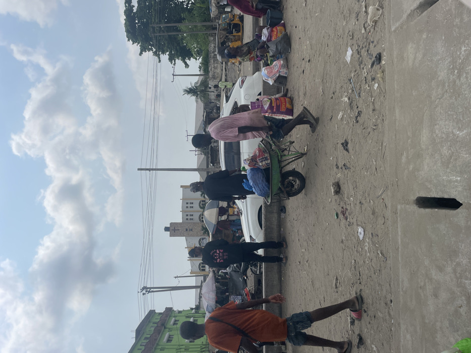 The image presents a busy outdoor market scene in Ojo, Nigeria, under a partly cloudy sky. The immediate foreground consists of uneven, light-brown dirt ground, scattered with debris, and a concrete slab featuring a dark, rectangular drain opening. A young male in an orange t-shirt and blue shorts, wearing a dark flip-flop on his right foot and a reddish-pink one on his left, walks towards the left of the frame. Behind him, a male in a black hoodie with a white graphic print on the back stands facing away from the camera. Adjacent, a white SUV is parked, and a male in a dark garment and cap stands nearby. A male in a light pink t-shirt pushes a green wheelbarrow loaded with blue and white sacks towards the right. On the right side of the frame, several individuals, predominantly women, are seated on the ground amidst numerous large sacks, some labeled "Quality Rice" and "PEAS," indicating market goods. Multiple yellow motorized tricycles (Keke Napep) are visible further back on the right. In the background, a light-colored church building with a cross on its central steeple is prominently visible. To the far left, a multi-story building with a bright green facade is present. Utility poles with multiple overhead wires span the upper midground. The environment suggests an active urban commercial area.