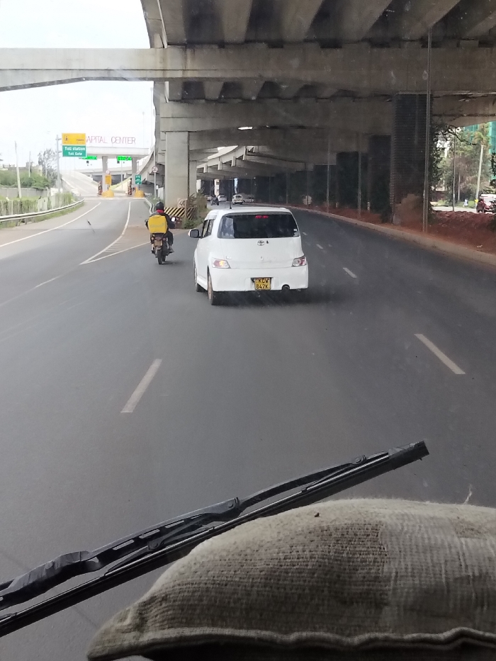 The image captures a highway scene in Nairobi, Kenya, specifically at the approach to the Capital Centre toll station on the Nairobi Expressway. Viewed from within a vehicle, a black windscreen wiper blade and a beige, textured dashboard cover are prominent in the lower foreground. A white Toyota bB (plate KCW 847K) proceeds in the right lane, while a motorcyclist, wearing a dark jacket and carrying a yellow delivery box, occupies the left lane slightly ahead. The background is dominated by multi-tiered concrete expressway pillars and overhead structures. A green sign, prominently displaying "CAPITAL CENTER Toll station Toll Gate," is visible on the left side of the road. The road surface is asphalt with white dashed lane markers. Distant vehicles and sparse vegetation are present beneath the elevated highway system. The sky appears overcast.