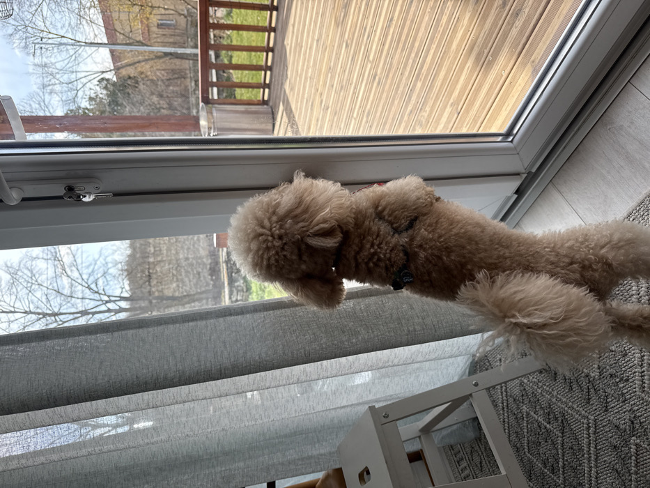 The image depicts an indoor-outdoor scene in Kipra, Bulgaria, characterized by natural daylight. In the foreground, a light brown poodle, appearing to be a miniature or toy breed, stands on its hind legs facing a glass exterior door. The dog wears a dark-colored harness or collar with a small, possibly blue, decorative element. Its tail is visible and fluffy. The indoor flooring consists of a light grey patterned rug, next to which a white two-step stool is partially visible on the left. Light grey sheer curtains are drawn to the left of the glass door. The glass door features a white frame, a white handle, and a keyhole from which two keys are suspended. Directly outside the door is a wooden deck constructed of horizontal planks, enclosed by a wooden railing. To the right on the deck, a tall, cylindrical, silver-colored trash receptacle is present. Beyond the deck, patches of green grass are visible, leading to a retaining wall or embankment. The distant background reveals deciduous trees with bare branches under a light blue sky, suggesting a cooler season or early spring. A building with a reddish-brown roof and walls is discernible through the trees.