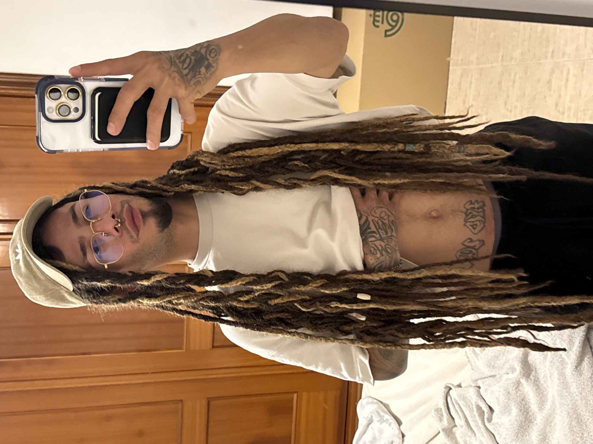 A man with light brown dreadlocks, wearing a beige cap, gold-framed eyeglasses, and a white t-shirt, is holding a white and blue smartphone with multiple lenses in front of a mirror. He has tattoos on his left forearm, stomach, and right arm. He is also wearing black pants. The background includes a wooden door or wall with rectangular panels, a cardboard box, and a bed covered with a white sheet. The location is a residential interior. The specific location in Yaiza, Spain is not discernible from the image.