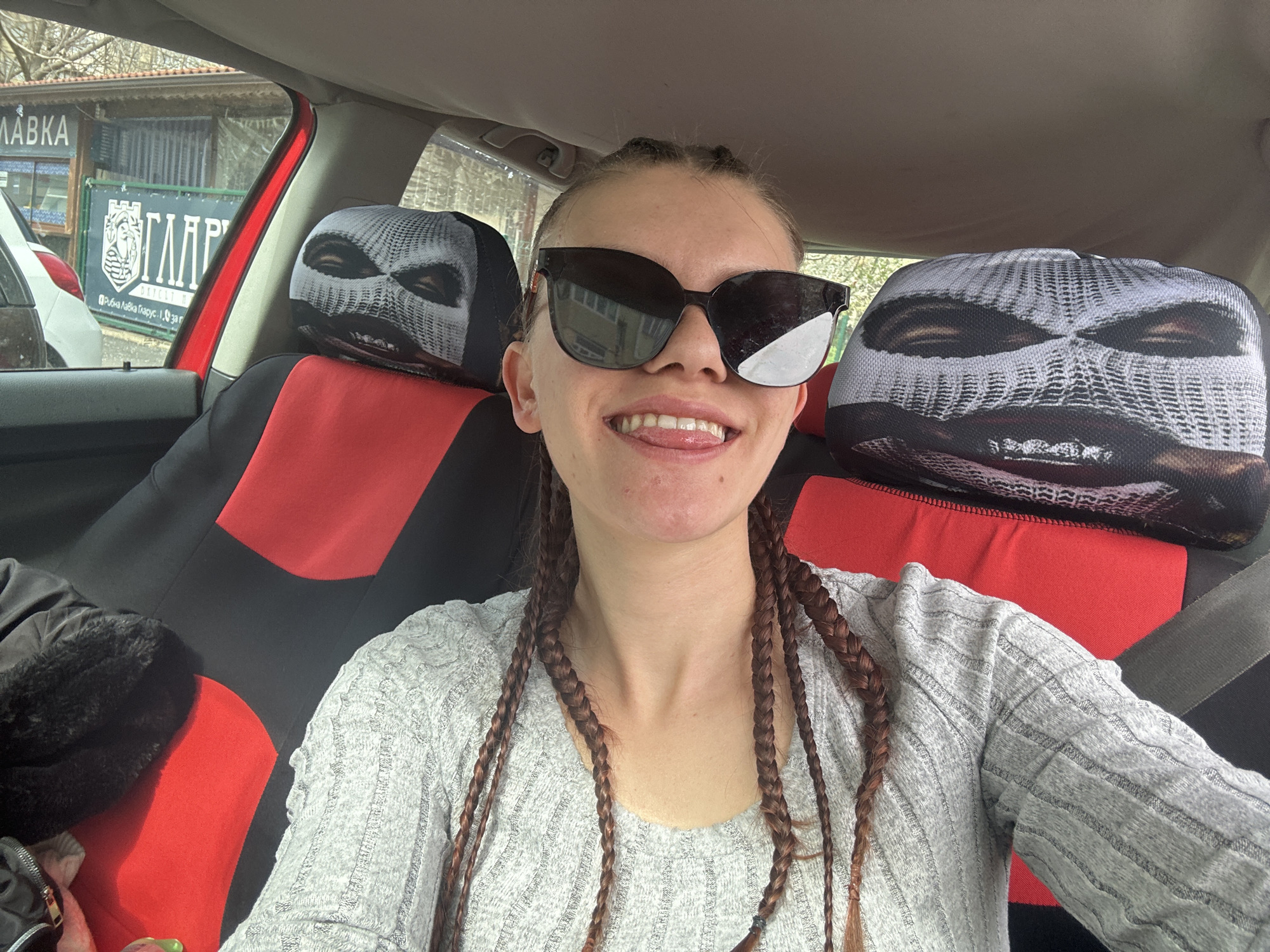 A person is inside a car, visible from the chest up, wearing oversized sunglasses, a light gray, long-sleeved shirt with braids. The person is sticking their tongue out. The driver and passenger seats have red and black covers with headrests, where the headrests are decorated with depictions of faces wearing knitted ski masks. Through the car window, part of a building is visible. It bears the sign "ЛАВКА", and below that in Cyrillic, "ГАЛАРД." The address, also in Cyrillic, is "Рибна Автка Гарус, 1". According to the inscription, the location is Varna, Bulgaria, which is identifiable as the address of a fish shop in Varna. A jacket or coat is visible on the car seat to the left.