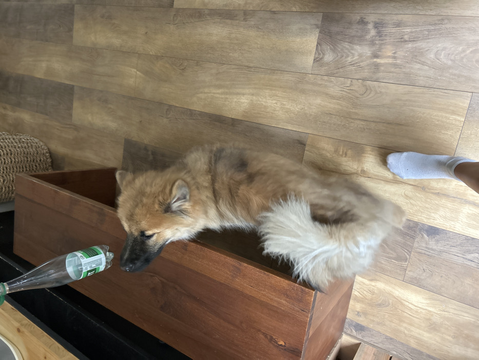 In an interior setting in Saint-Galmier, France, a light-brown furred dog with a fluffy, curled tail stands on a light brown wooden plank floor. The dog faces left, its head tilted upwards, looking towards a dark brown wooden bench or low cabinet. On the surface of this wooden structure, a clear plastic bottle with a green label stands upright. Partially visible in the upper right background is a light brown woven basket. A human foot, clad in a white sock, is positioned on the wooden floor in the lower right foreground, near the dog's rear.