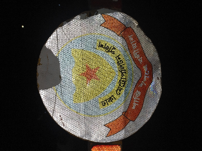 A circular emblem dominates the frame, its surface comprised of small, shimmering dots creating an iridescent effect. The emblem's colors include silver, blue, yellow, and red. A red star resides at the center, surrounded by concentric yellow and blue fields. The words "ঢাকা মেট্রোপলিটন পুলিশ" appear in Bengali script. A curved red banner runs through the emblem. Portions of the sign are damaged. The background is dark and indistinct.