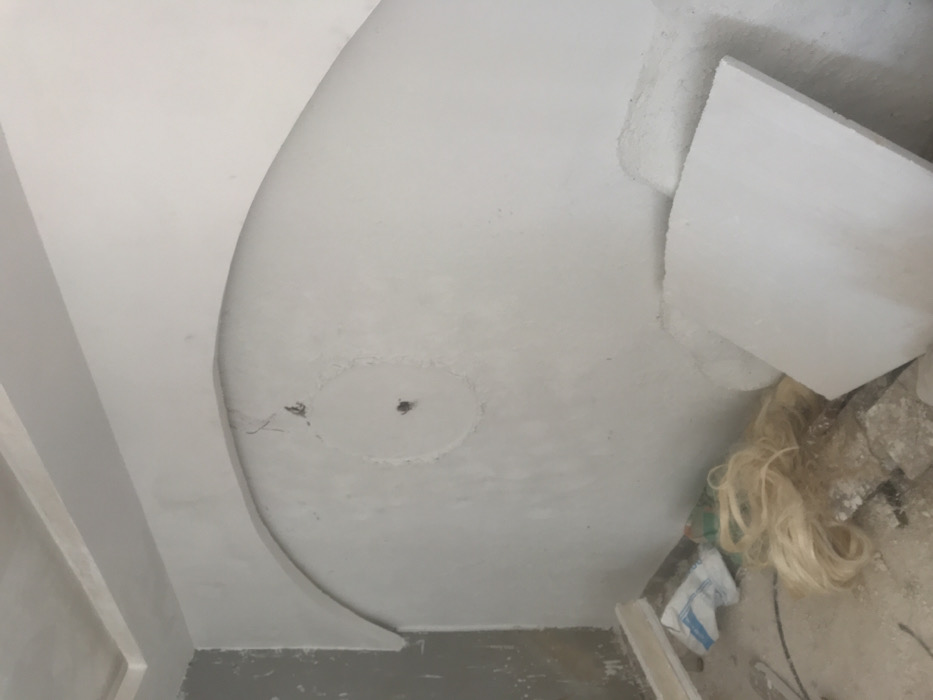 The image depicts an interior room under renovation or construction in Kwang, Nigeria. The dominant feature is a light-colored, plastered wall with a decorative arch spanning across its upper portion. Below the arch, a circular patch with a central dark hole, possibly for an electrical fixture, is visible on the wall, with loose wires extending from above it. The wall on the immediate left appears to be a darker, unfinished gray. The ceiling, visible at the top, is white with a simple cornice molding. The concrete floor is unpolished and covered with construction debris. Objects on the floor include a pile of blonde synthetic hair, a crumpled white bag, and several irregular white fragments, possibly plasterboard or foam insulation, leaning against the wall in the lower right corner. No individuals are present in the scene.