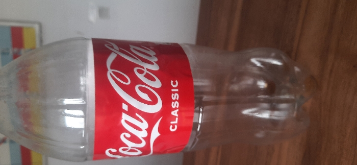- "An empty, clear plastic Coca-Cola "CLASSIC" bottle stands upright on a brown wooden surface" by FM-0zE9q2, licensed under CC BY 4.0