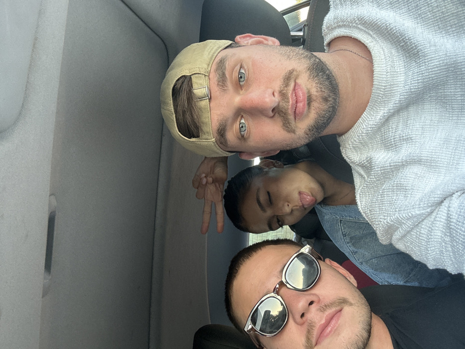 Three individuals are depicted in a selfie taken inside a vehicle, located in Kfar Ruth, Israel