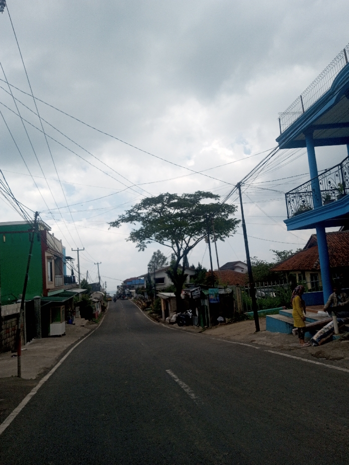 The image displays a street scene in Kalchini, India, under an overcast sky. A dark asphalt road, featuring a partial white dashed line on its left side in the foreground, ascends gradually and curves slightly into the distance, flanked by buildings and utility infrastructure. On the left side of the road, a sidewalk runs parallel to the street, bordered by multi-story buildings, including a prominent structure with a green ground-floor facade and a lighter upper level. Several smaller, stall-like structures are visible below these buildings. Numerous utility poles support a complex network of overhead electrical or communication wires that crisscross the sky. On the right side of the road, a distinct two-story building painted bright blue features a balcony with intricate dark metal railings on its lower level, and a wire mesh fence extending above the roofline of its upper story. Directly below this blue building, a woman dressed in a yellow garment and head covering stands on a light blue-painted step. Adjacent to her, a man in a light-colored shirt is seated on a low, possibly concrete, structure or a pile of materials. Further down the street on this side, a large tree with a dense green canopy partially obscures residential buildings with reddish-brown tiled roofs. Additional utility poles and overhead wires are present on this side, extending into the background where more buildings line the ascending road.