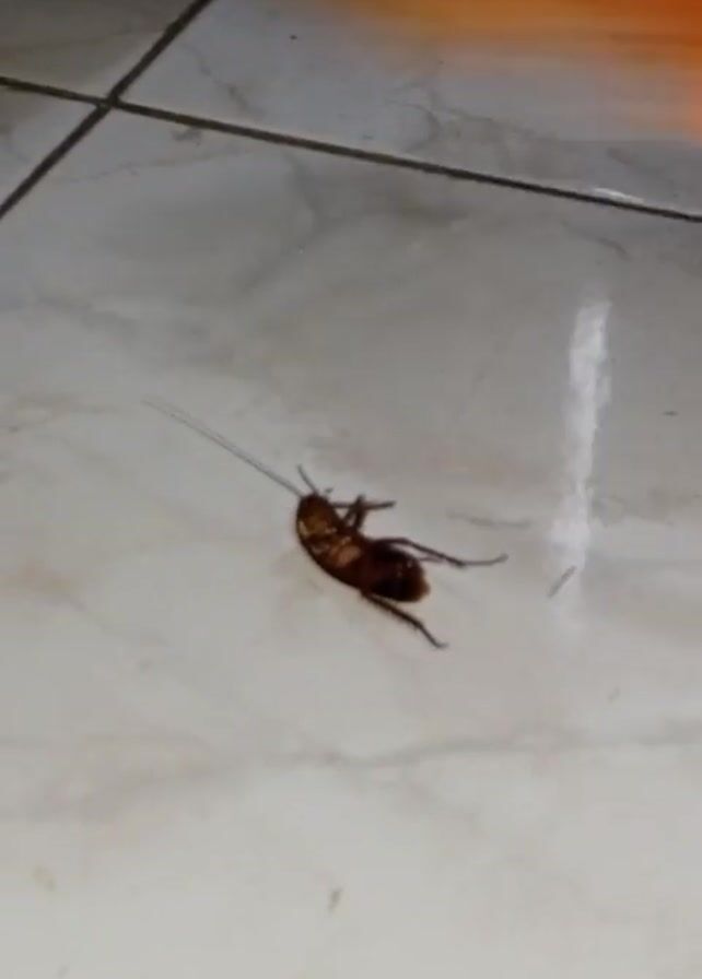 cockroach lying on its back on a tiled floor