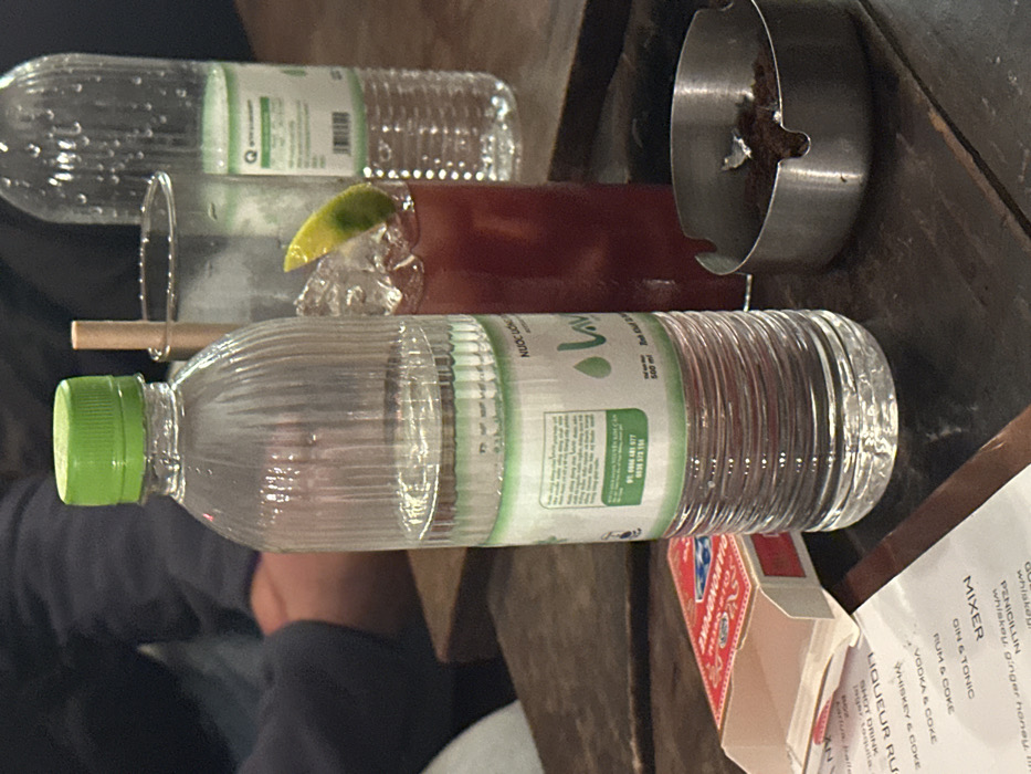 The scene depicts a tabletop view in an indoor establishment within Đồng Văn Commune, Vietnam. A dark wooden table surface holds several items. In the foreground, left of center, an open, red and white "ĐIỆN BIÊN" cigarette box lies empty. Adjacent to it, a clear ribbed plastic bottle of Lavi drinking water, 500ml, with a bright green cap, stands approximately three-quarters full. To its right, a tall, clear glass contains a dark red beverage, numerous ice cubes, and a lime wedge garnishing the rim. Behind this glass, a light-colored wooden straw is partially visible. Further to the right, a second clear plastic water bottle is present, mostly full, with a partially obscured label. In the immediate bottom right, a round, silver-toned metal ashtray contains brown ash and several cigarette remnants. A blurred menu or paper is visible in the bottom left, showing partial text entries like "LIQUEUR RUM," "WHISKEY & COKE," and "GIN & TONIC." In the background, out of focus, a person's dark-clothed arm and torso are partially visible, suggesting their presence at the table.