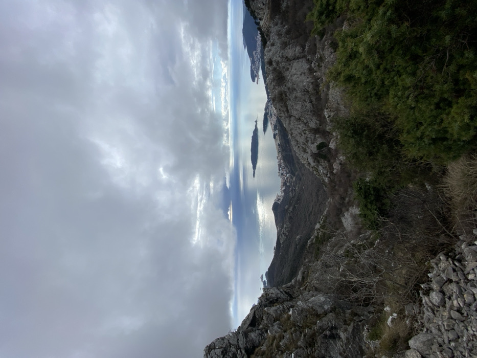 A high-angle panoramic photograph captures a coastal landscape from a mountainous vantage point in Brajici, Montenegro. The upper two-thirds of the image are dominated by a heavily overcast sky, filled with dense, grey clouds that obscure direct sunlight. Breaks in the cloud cover allow shafts of sunlight to illuminate the calm, dark blue-grey surface of the Adriatic Sea, creating a shimmering reflection path in the mid-distance. Below the horizon, an elongated island lies offshore. Along the coastline, a built-up area, likely a town or city, is visible, characterized by numerous white and light-colored structures nestled at the base of the mountains. Further to the right along the coast, another smaller settlement is discernible. The foreground and midground feature rugged, rocky mountain terrain. Grey and white rock formations, some covered in sparse scree, are prevalent. Interspersed among the rocks are patches of dry, bare deciduous trees, scattered green evergreen shrubs, and clumps of dry grass. Small, isolated patches of what appears to be snow or frost are visible on the rocks in the immediate foreground, indicating cool conditions. The mountainous slopes descend steeply towards the coastal plain. No individuals, vehicles, or specific human activities are visible within the frame.