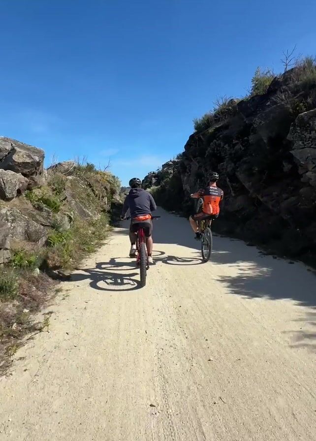 Two people are riding bicycles on a dirt path. The person in front is doing a wheelie. Both people are wearing helmets and athletic clothing. The path is bordered by rocks and foliage on either side. The sky is clear and blue.