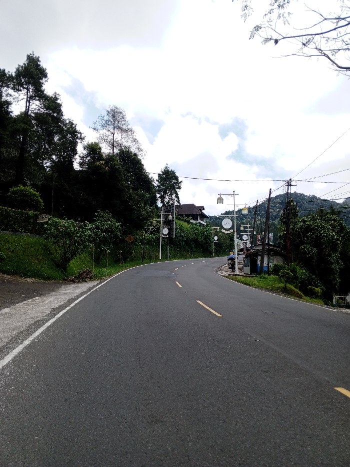 The image displays an unoccupied, curving asphalt road in Multhan, India, under an overcast sky. The road features yellow dashed center lines and a white solid edge line on its left side, and appears to ascend gradually towards the right. To the immediate left of the road, a grassy embankment rises, densely covered with dark green vegetation and mature trees. A small white sign bearing the number "89" is visible on this slope. Along the right side of the road, a sequence of white, ornamental streetlights with lantern-style fixtures and circular white signs is installed. Further down the right side, a small, single-story structure with a light blue base and a dark roof is present, alongside utility poles supporting overhead wires. In the mid-distance on the right, a large building with a dark, multi-gabled roof is situated on a lush, tree-covered hillside, partially obscured by foliage. The background comprises tree-clad hills against a cloudy, light gray sky. No individuals, vehicles, or animals are present within the scene.