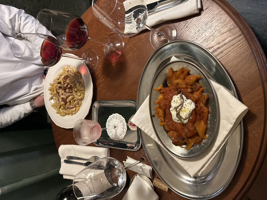 The image depicts an indoor dining scene at the P.I.P.A. restaurant, located at Soborna Square 10, Dnipro, Ukraine. The setting is dimly lit, centered on a dark wooden, round table. Two individuals are partially visible. One person is seated in the background, visible from the torso upwards, wearing a white long-sleeved top and a metallic watch on their left wrist. A second person's lower leg, clad in blue jeans, is partially visible on the far right side of the frame. The table is laden with multiple dishes and beverages. In the upper center, a white, intricately rimmed plate holds a serving of elbow macaroni pasta covered in a creamy sauce and topped with crumbled bacon. To its right, two clear stemmed wine glasses contain red wine. An additional empty stemmed wine glass, displaying a partial "MONTE DEI... BAROLO" label, rests in the mid-left foreground. A small silver rectangular tray, positioned in the mid-left, holds a delicate stemmed cocktail glass containing a light pink liquid with a subtle garnish, resting on a white paper doily. In the lower center, a small oval metal dish, nested within a larger oval metal platter, contains an orange-reddish pasta or gnocchi-like dish. This dish is topped with a dollop of white soft cheese or cream, a drizzle of olive oil, and three small silver-colored fish fillets, consistent with anchovies. Several folded white cloth napkins and various pieces of silver cutlery (forks and knives) are arranged around the dishes and glasses. A cork is visible on the table surface near the bottom left corner. The background consists of a dark green, possibly fabric, wall covering. The scene indicates a meal for at least two individuals.