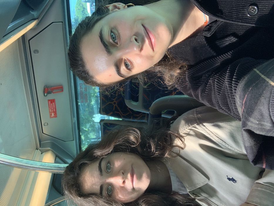 Two young adult females are seated side-by-side inside a public transport bus, likely in Lisbon, Portugal, captured in a daylight selfie