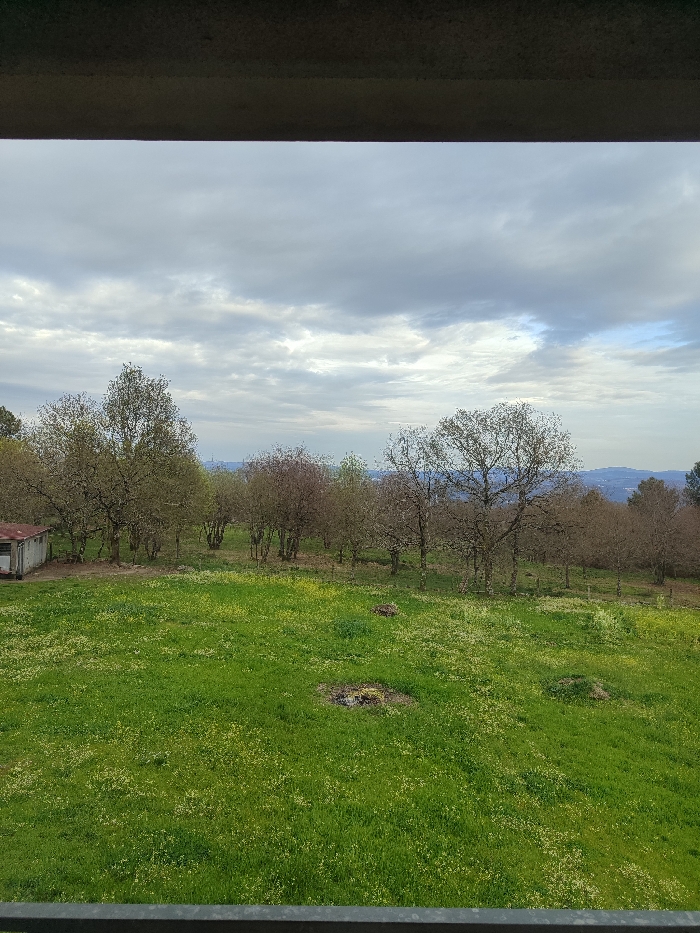 The scene depicts an outdoor landscape in Vila Real, Portugal, observed from an elevated perspective. A dark, horizontal, rectilinear structure, likely a balcony railing or sill, frames the bottom portion of the image. The midground features an expansive, verdant green lawn speckled with numerous small white flowers and sporadic yellow blooms. Within this grassy area, two distinct circular patches of disturbed dark earth or debris are visible. The background consists of a dense line of deciduous trees exhibiting varied stages of early spring growth, with some displaying fresh light green foliage and others remaining largely bare or with reddish-brown leaves. To the far left of the tree line, a small, single-story utility building or shed with a reddish-brown roof and light-colored walls is partially visible. The distant horizon reveals a subtle, hazy outline of urban or mountainous terrain. The sky is largely overcast with a mix of grey and white clouds, allowing for intermittent glimpses of lighter blue. No individuals, actions, or direct interactions are visible.