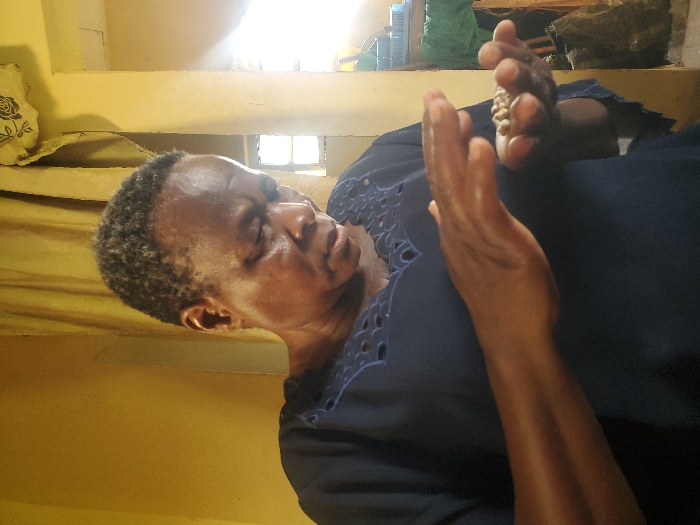 An adult female is depicted indoors in Minna, Nigeria. She has dark skin, short, curly dark hair, and wears a dark blue top with an intricate cut-out pattern around the neckline. Her gaze is directed downward, focused on her hands. In her right, cupped palm, she holds approximately 10-15 light-colored, oval-shaped seeds or beans. Her left hand is positioned above her right, fingers slightly open, suggesting she is in the process of examining or sorting the contents. The immediate background features pale yellow painted walls and light-colored curtains. A bright window is visible on the right side, admitting significant natural light and creating a glare. Indistinct furniture or objects are partially visible in the distant background on the right.