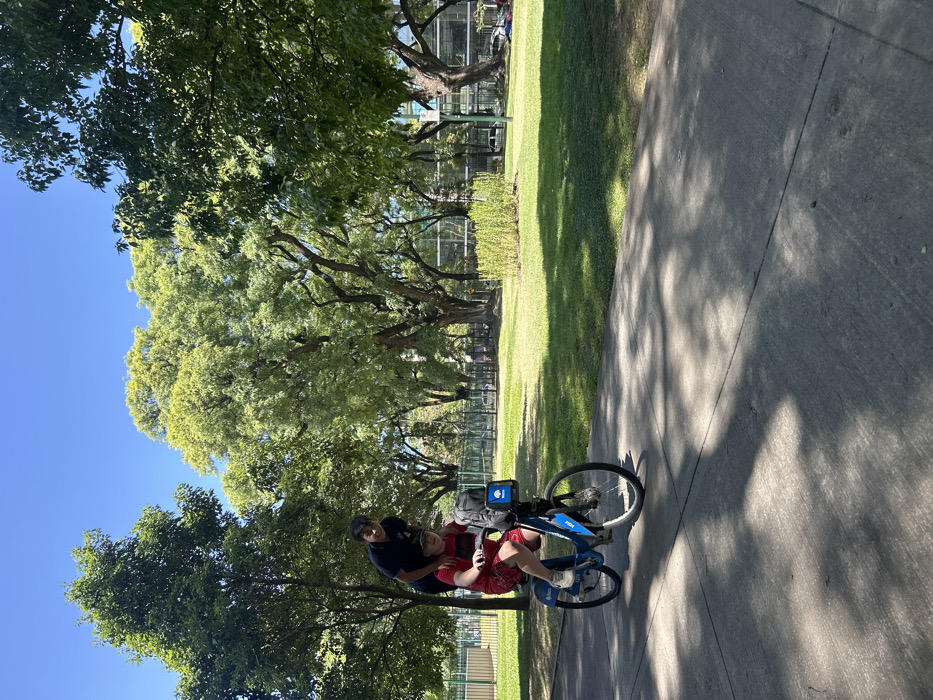 A man pushes a blue rental bicycle with another person sitting on the handlebars. They are on a concrete path in a park, shaded by trees. A grassy area borders the path, and more trees line the background under a clear blue sky. Some buildings and a fenced area can be seen in the distance through the trees.