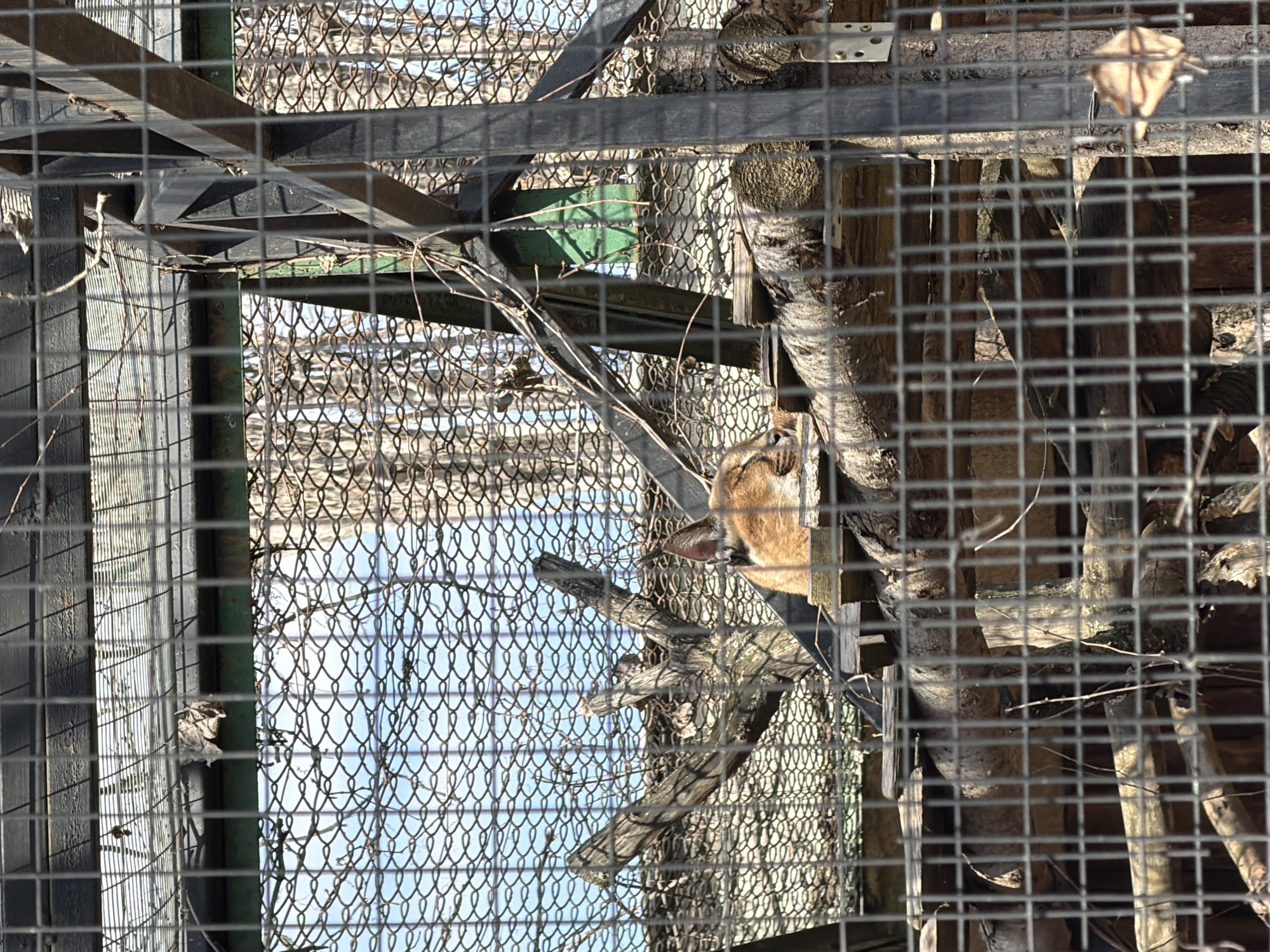 The scene depicts an orange-brown caracal, identifiable by its pointed ears and fur coloration, resting within a zoo enclosure at the Sofia Zoo, Sofia, Bulgaria