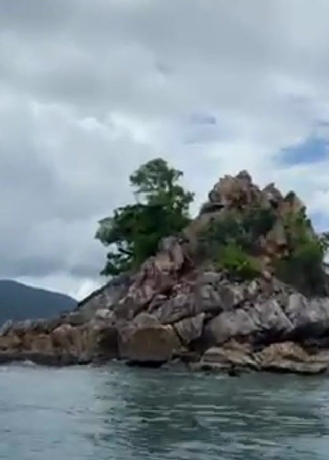rocky island in a body of water, likely the sea, under a cloudy sky. A small tree grows on the left side of the island. As the camera zooms in, a person is visible climbing on the rocks near the top. The water is turquoise and calm.