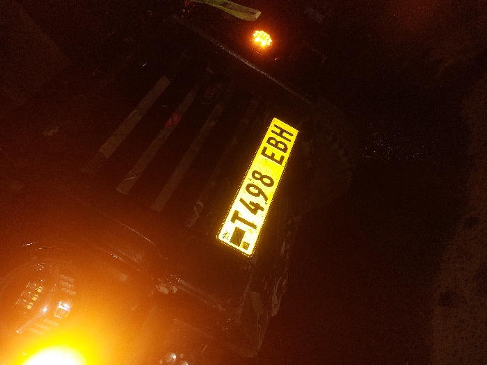 In Msata, Tanzania, a nighttime scene captures the rear section of a dark-colored motor vehicle. The vehicle displays a rectangular yellow license plate with black lettering, oriented diagonally from lower-left to upper-right, reading "T 498 EBH". A prominent, circular orange-yellow light source is visible on the vehicle's left side (image upper-left), with a smaller, amber light on the right side (image mid-right). Multiple horizontal, dark-toned reflective strips are affixed to the vehicle's upper body section, above and to the right of the license plate. The immediate ground below the license plate appears dark and exhibits areas of possible moisture accumulation or reflections. No persons are present; no actions or interactions are discernible.